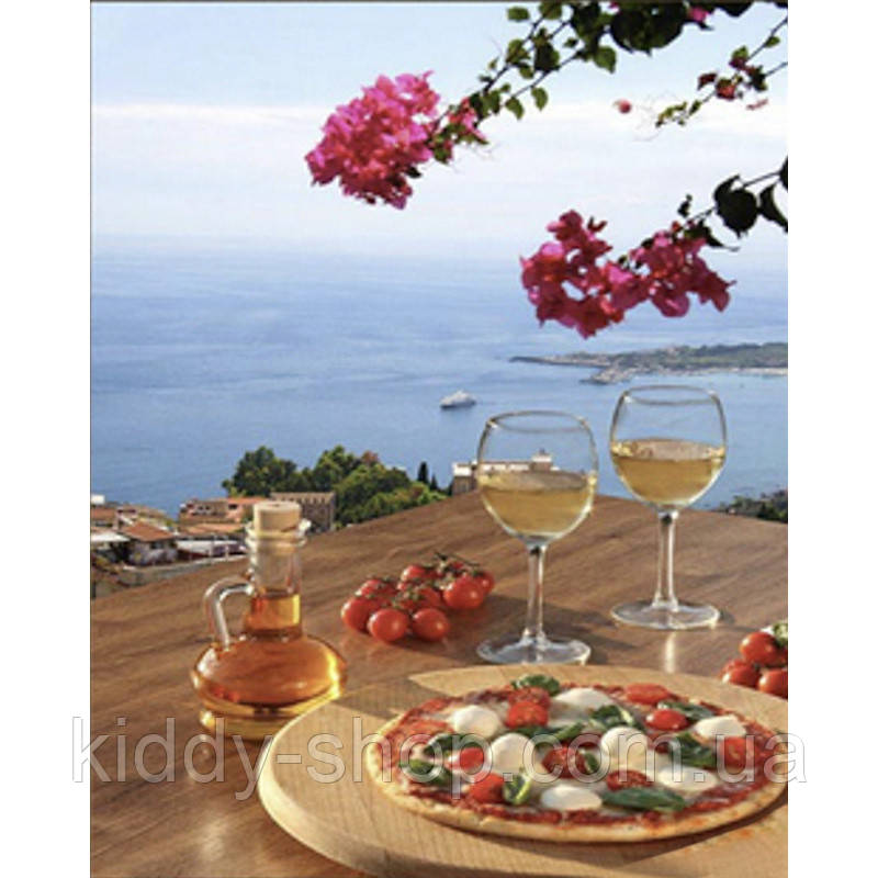 Діамантова вишивка. Картина на підрамнику Преміум Італійська піца з келихом білого вина, розмір 40x30 см